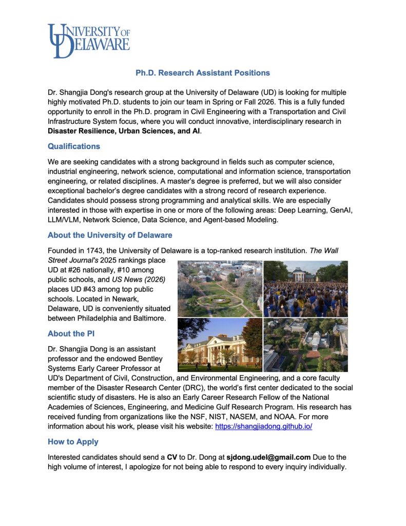 PhDs in Transportation and Civil Infrastructure Systems at the University of Delaware, USA